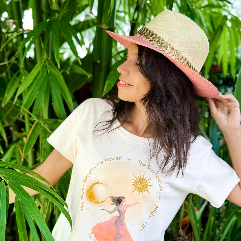 The Diamond Sun Hat is crafted from fine straw and features a classic teardrop crown, an absorbent internal sweatband, and is elegantly finished with a shimmering golden ribbon that catches the light with every movement.