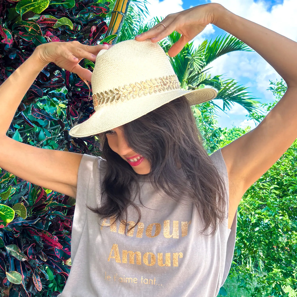 The Diamond Sun Hat is crafted from fine straw and features a classic teardrop crown, an absorbent internal sweatband, and is elegantly finished with a shimmering golden ribbon that catches the light with every movement.