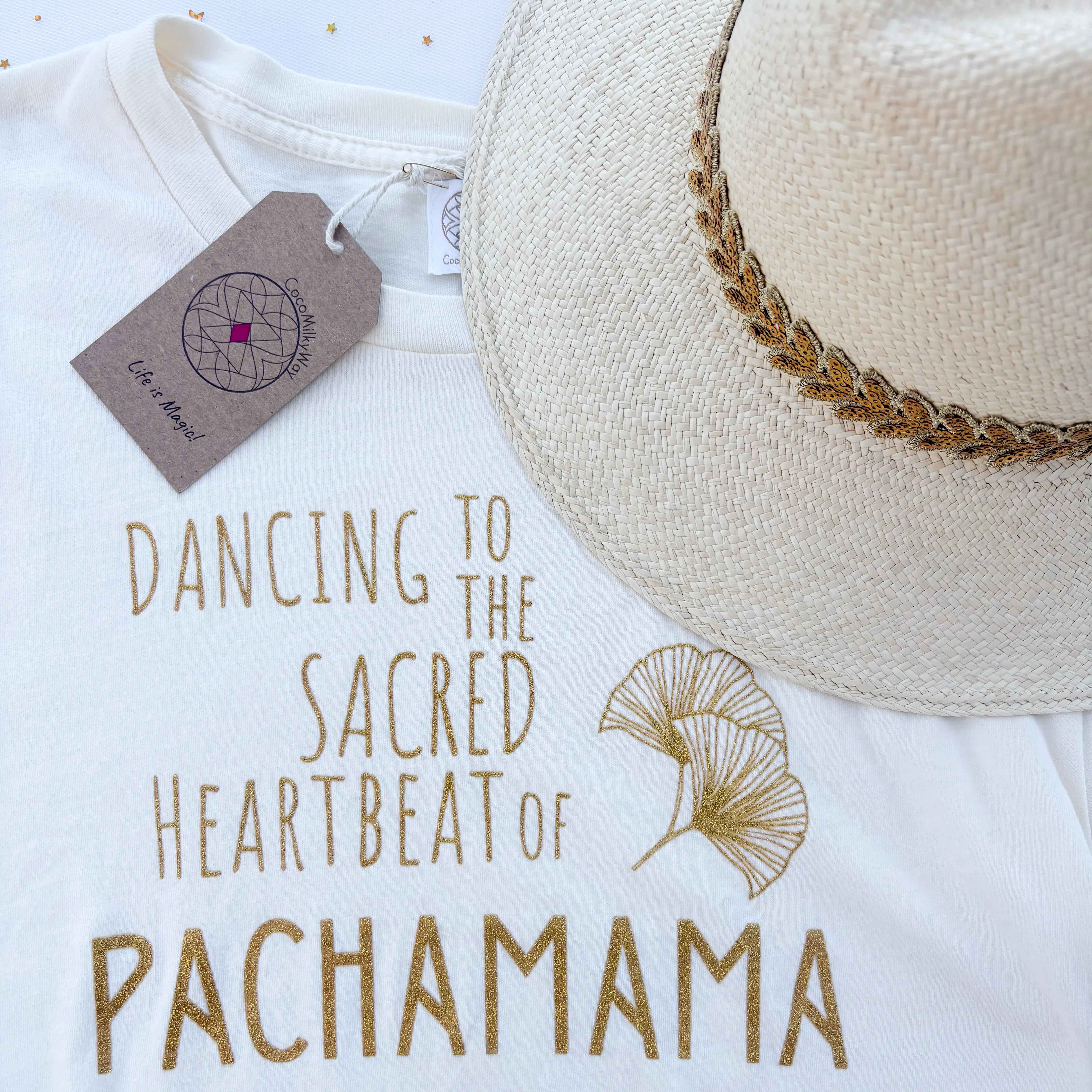 Cream Cotton Tshirt, glittering gold print